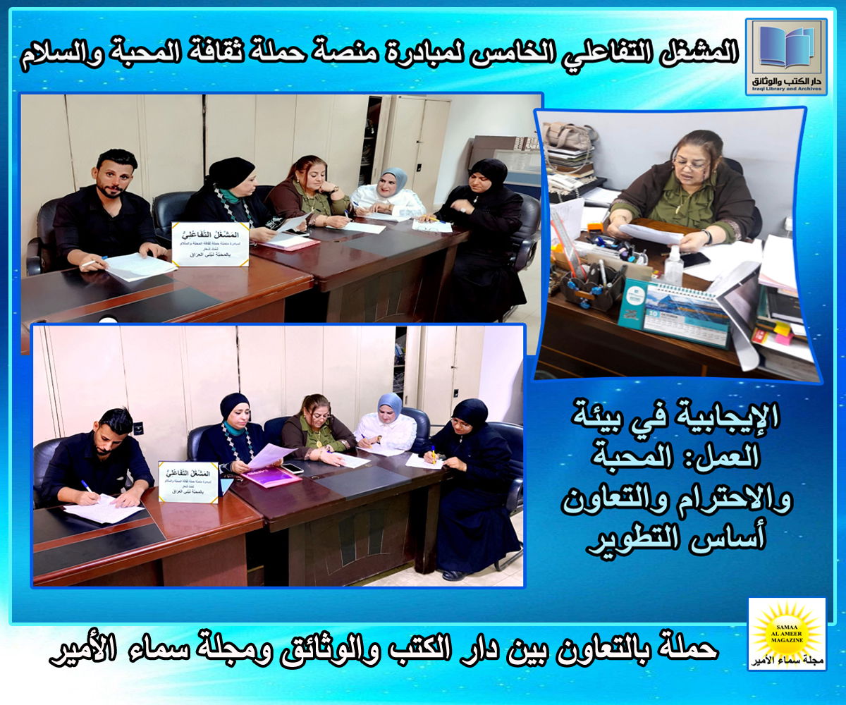 بإشراف المدير العام لدار الكتب والوثائق السيد بارق رعد علاوي أقامت منصة مبادرة حملة ثقافة المحبة والسلام التي أطلقت بالتعاون بين الدار ومجلة سماء الأمير الإلكترونية الرقمية، المشغل التفاعلي الحضوري الخامس، تحت عنوان "الإيجابية في بيئة العمل: المحبة والاحترام والتعاون أساس التطوير"، صباح يوم الأربعاء، الثامن من أيلولَ 2025، لموظفي قسم الدوريات في الدار، بحضور مديرة المكتبة الوطنية السيدة بان صلاح الدين جلال.